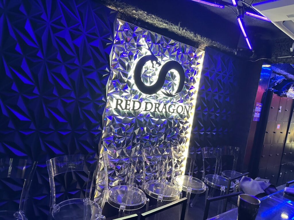 レッドドラゴンは心斎橋筋商店街から一本入ったビルの5Fに位置し、赤と黒を基調にしたドラゴンロゴが目印。